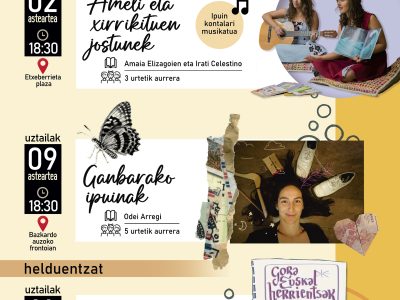 IPUINGIRO ekimenaren bidez, herriko beste hiru txokootan eskainiko dugu ikuskizun bana: Etxeberrieta plazan, Bazkardo auzoko frontoian eta Plaza Morean.