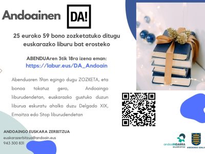 Euskal kultura sustatzeko helburu eta Durangoko Azokaren 59. edizioa (DA!) ospatzeko Andoaingo Udalak euskarazko liburuak erosteko 25 euroko 59 bono zozketatu berri du abenduaren 3tik 18ra izena eman zutenen artean.